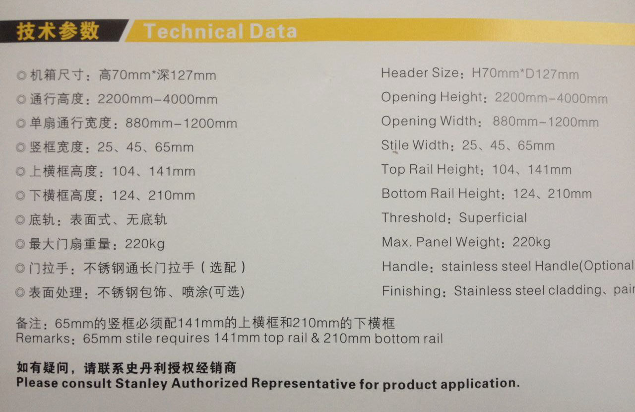 門體及機箱全鋁結構,方便於加工和現場安裝的需要旁柱可選設計,底軌表麵式和地軸隱埋式安裝,滿足不同場所的安裝需求。機械鎖內部旋扭設計滿足消防疏散等要求!
